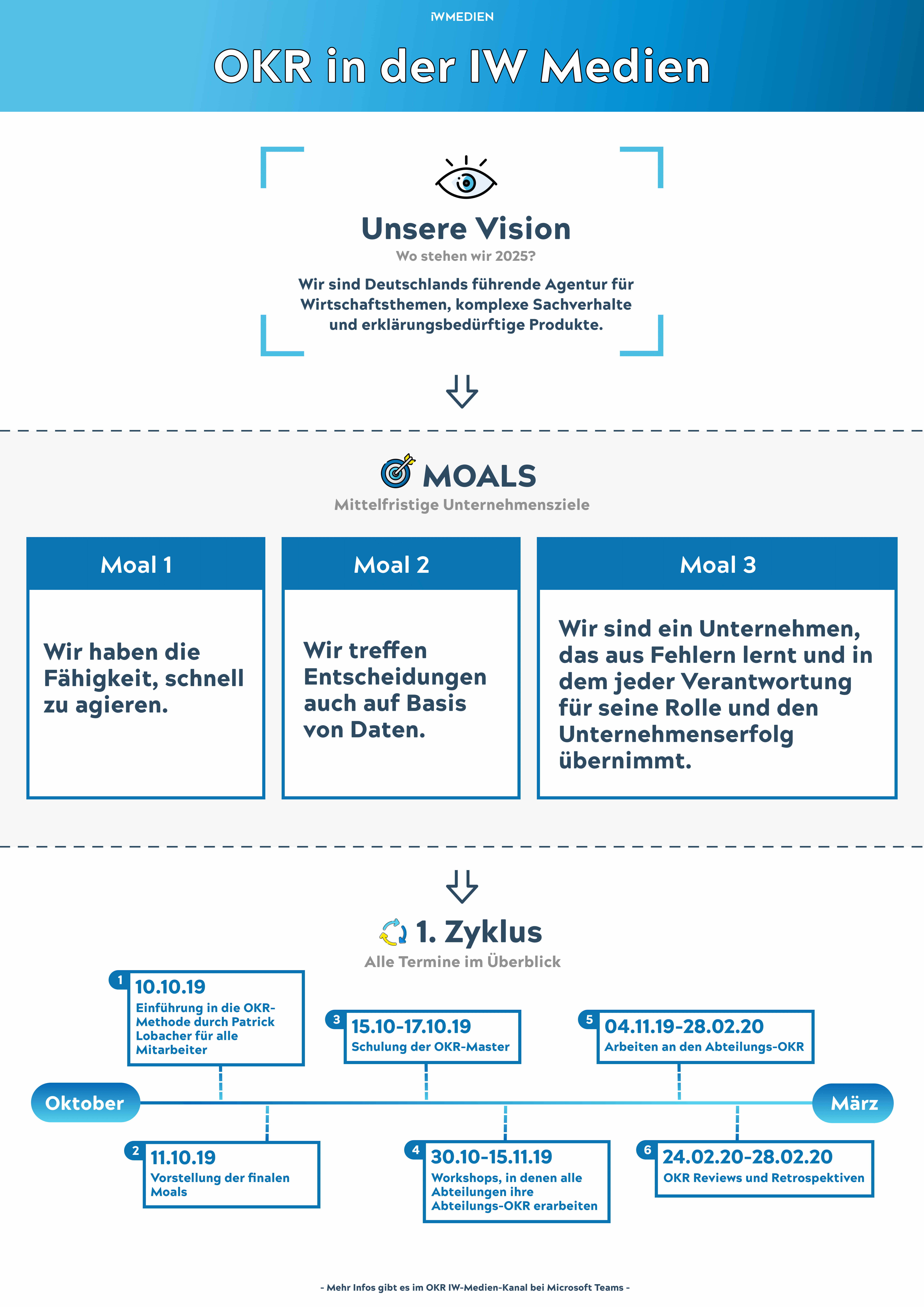 Der organisatorische Rahmen von OKR vereint Top-down- und Bottom-up-Handeln: Einmal im Jahr legt ein Strategieboard aus Geschäftsführung und Führungskräften auf Unternehmensebene sogenannte Moals fest, das sind „Mid-term goals“, also mittelfristige Ziele. Diese sind aus der Vision und Strategie des Unternehmens abgeleitet. Um die Moals zu erreichen, erarbeitet jedes Team alle vier Monate Objectives, die auf die übergeordneten Moals einzahlen, und die Objectives werden wiederum in mehrere Key Results zerlegt. Dabei ist ein Objective eher abstrakt formuliert, zum Beispiel „Unsere organische Reichweite rockt in allen Digitalprojekten“. Die Key Results, die darauf einzahlen, sind dann aber messbar. Um beim Beispiel zu bleiben, könnte man also sagen: „Wir steigern die Zugriffe über die Google-Suche auf Webseite XY um Z Prozent.“ Die Os und die KRs legen wir jeweils für Viermonatszyklen fest, die Moals haben ein Jahr lang Bestand.